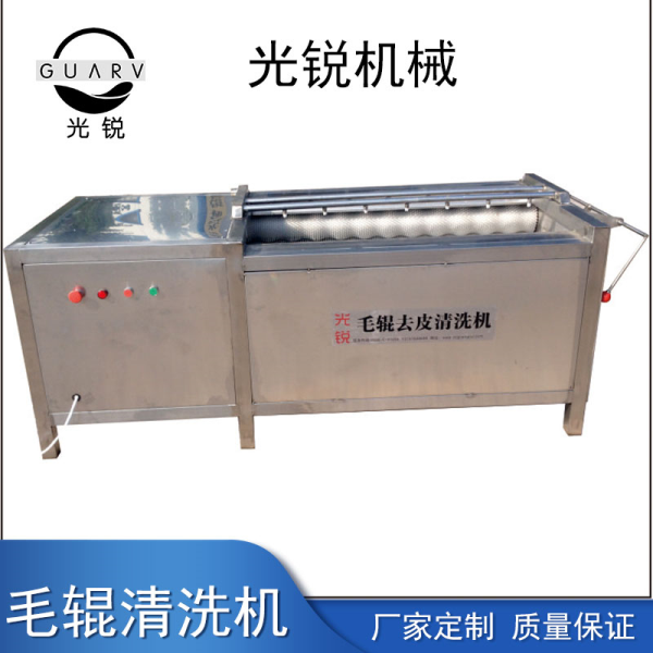 根莖去皮機工作時,是將根莖類蔬菜或球類果品放置在幾根可滾動的毛刷輥上在組成的U型料斗里使物料與旋轉(zhuǎn)的毛刷輥接觸產(chǎn)生表面摩擦,清水從噴淋水管中噴出沖洗物料,從而達到洗凈的目的。